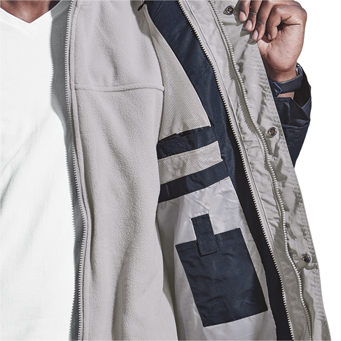 - Removable fleece inner jacket: Inner and outer pockets
